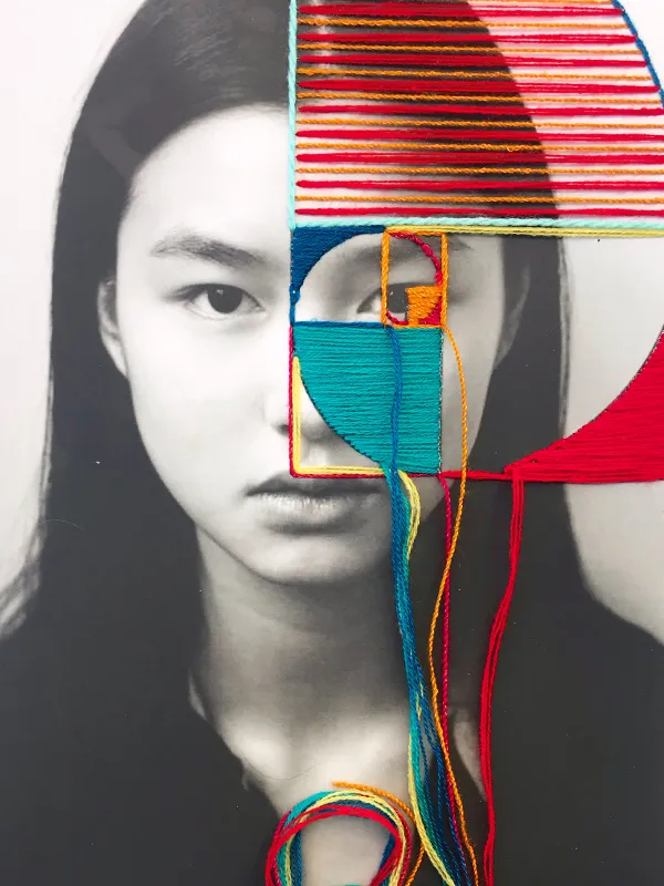Artist Victoria Villasana embroiders, sews, right into photos. She is "drawing" with her thread. Artists can use fiber materials like yarn to create various stitched lines.